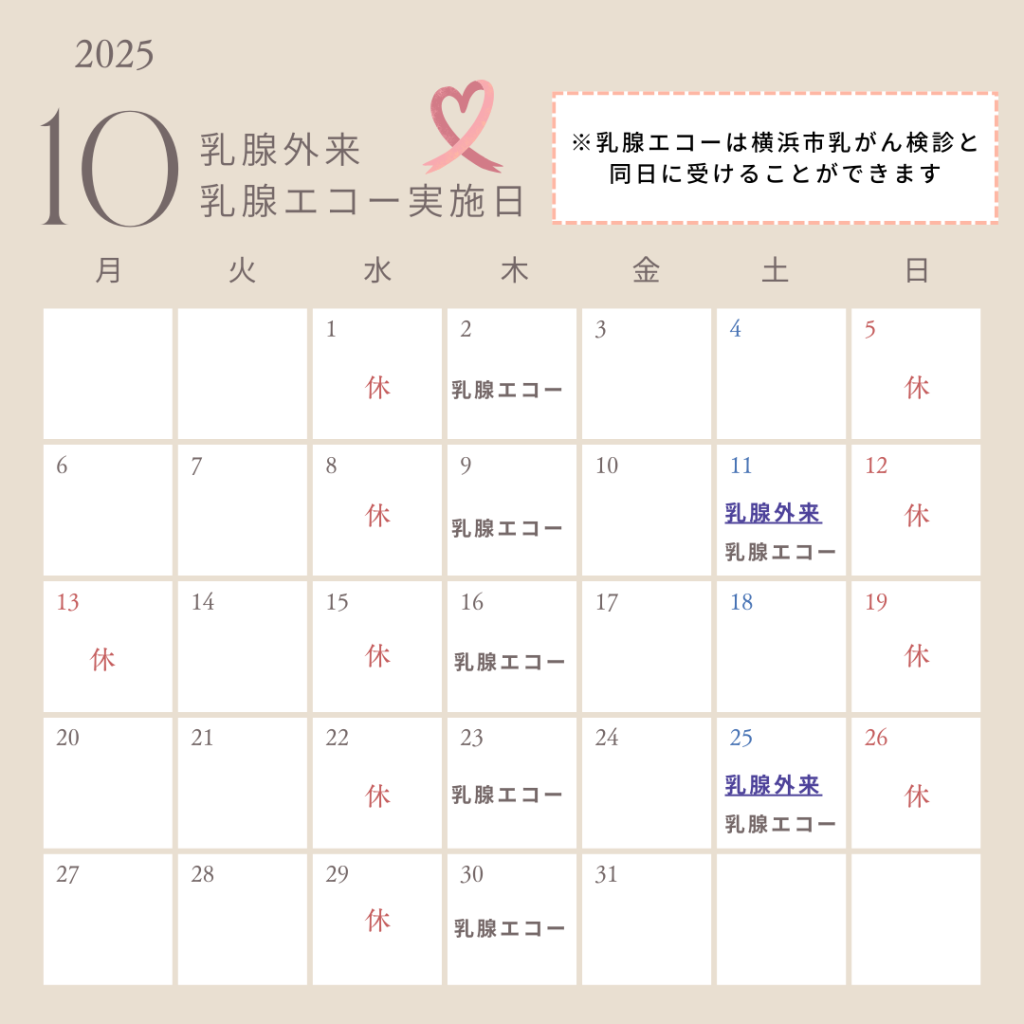 10月の【乳腺エコー・乳腺外来】の日程が決まりました。胸のしこりや痛み、分泌など、少しでも気になる症状がありましたら、ぜひこの機会にご相談ください。【ご予約はLINEから】https://lin.ee/vcpf12h
