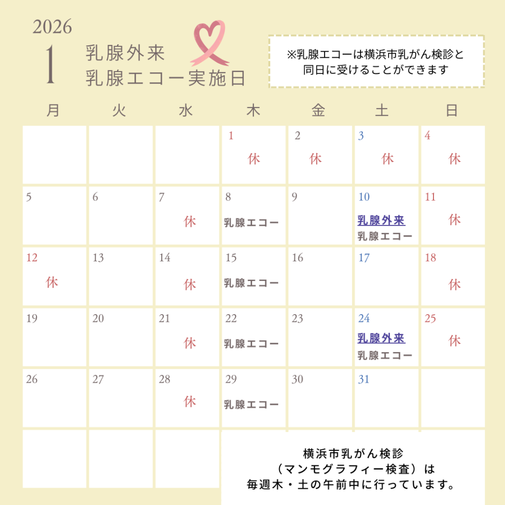 皆さま、こんにちは🌸1月の【乳腺エコー・乳腺外来】の日程が決まりました🗓️✨