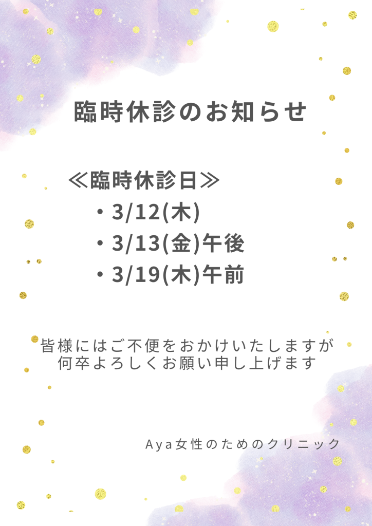 いつもAya女性のためのクリニックをご利用いただき、ありがとうございます。 下記日程は 臨時休診となります。 【臨時休診日】 ・3/12(木) ・3/13(金)午後 ・3/19(木)午前 ご不便をおかけいたしますが、何卒ご理解のほどよろしくお願いいたします🙏